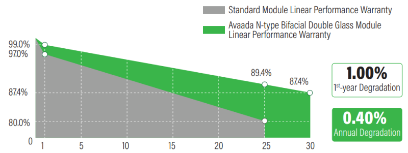 For 30 years with 1% for 1st year degradation and 0.40% from year 2 to year 30.